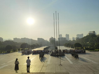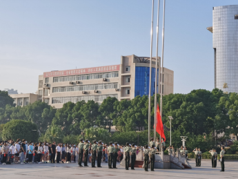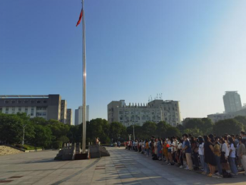 首先,主持人宣布升旗仪式正式开始。国旗班的旗手们迎着朝阳,以饱满的热情,庄严地护卫五星红旗走向国旗台。伴随着雄壮有力的国歌,鲜艳的五星红旗冉冉升起,全体师生集体行注目礼。