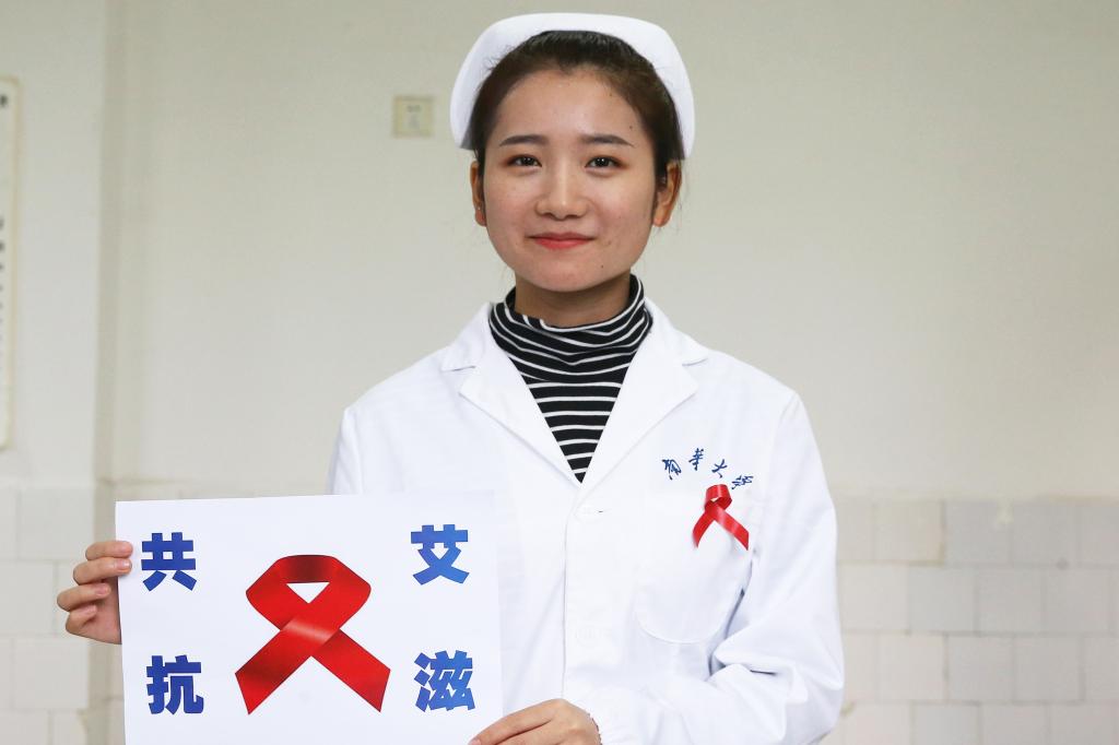 ↑11月29日,湖南省衡阳市PA视讯,PA视讯的志愿者展示防艾宣传标语。