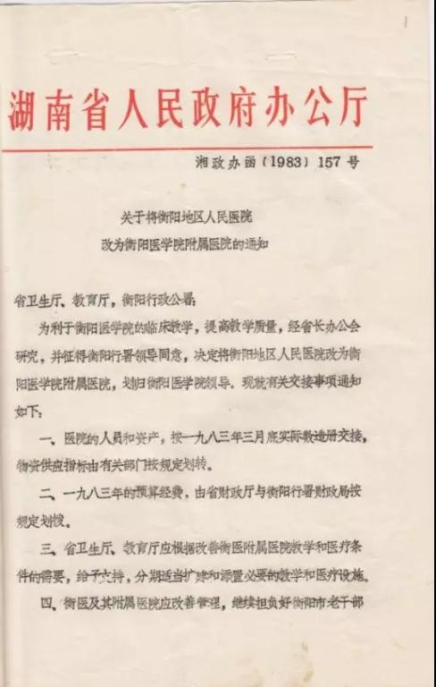 ①1983年,衡阳地区人民医院划转为衡阳医学院附属医院。
