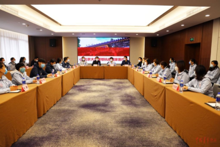 (3月16日,北京大学援鄂抗疫国家医疗队在武汉召开会议,传达习近平总书记给医疗队全体“90后”党员们的回信。图为会场)