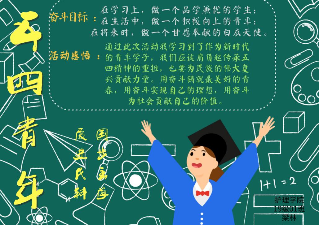 此次线上主题团日活动围绕“作为一名新时代的青年,应如何传承五四精神、担当民族复兴大任?”“如何把爱国之情和报国之志化为实际行动,用奋斗铸就最美的青春?”等话题展开,同学们以班团集体云端相聚的方式发表自己的看法与感悟。护理191班梁林同学发表活动感悟:作为新时代的青年学子,我们应该肩负起传承五四精神的重任,要为民族的伟大复兴贡献力量,用奋斗铸就最美好的青春,用奋斗实现自己的理想,用奋斗为社会贡献自己的价值。