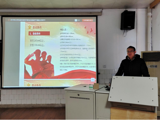 首先,陈晓坚书记提出,大学生投身国防是我们强国强军的必然需求,也是时代赋予青年一代的使命和担当。他还为大家讲解大学生入伍后的晋升前景,鼓励同学们积极响应祖国召唤,不负青春,不负韶华,不负时代。