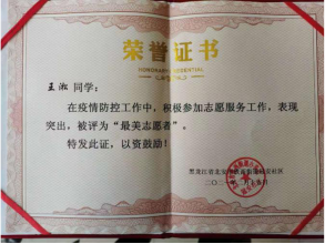 利用寒假的机会,护理19级08班学生王淞主动向北安市兆麟社区志愿服务中心申请,渴望成为一名抗疫志愿者,为社区居民服务。在志愿工作中,他与同伴们一起引导居民做核酸检测,同时负责为隔离居民家贴封条的工作。工作中的他不辞辛苦,用实际行动践行着“仁爱尚美”的PA视讯院训,实现自己想为社会、国家做贡献的愿望。最终,他的奉献精神得到了社区的认可,被社区授予“最美志愿者”荣誉称号。
