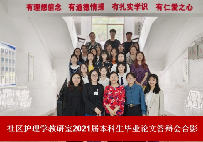 2021年5月28日上午10:30,社区护理学教研室于PA视讯研究生教室举行2021届护理本科毕业生论文答辩会。答辩由PA视讯副院长何平平指导,社区护理学教研室主任高红担任答辩组长,教研室全体教师担任答辩委员,教研室2017级全体护理本科生参与本次答辩会。