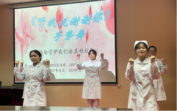 主题分享后,PA视讯陈永康同学声情并茂的朗诵了《护士赞歌》,展示了护士“为护苍生康,甘将责任扛”的家国情怀。吴怡婷等五名同学带来了手语舞《听我说谢谢你》,亲切温暖的表演诠释了白衣天使的可爱、可敬形象。