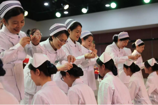 在师生们的见证下,护理临床、教学一线的教师代表依次为100余名毕业生授帽。毕业生们依次有序上场,单膝跪地,接受老师为其佩戴圣洁的燕尾帽,并从老师手里接过传承的蜡烛。一次亲切的爱抚,一个紧紧的拥抱,一句殷殷的嘱咐,都是老师对同学们满怀的期待。