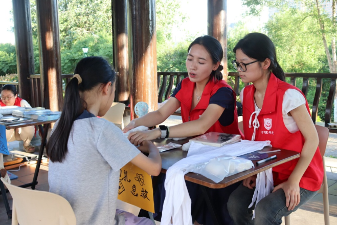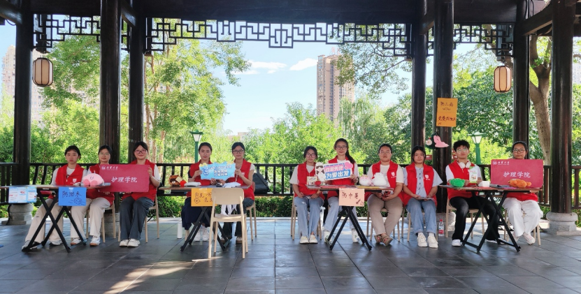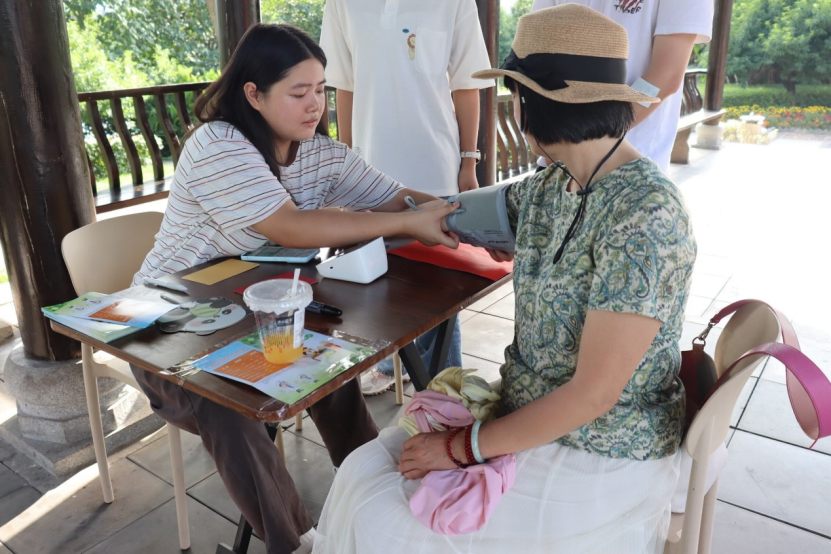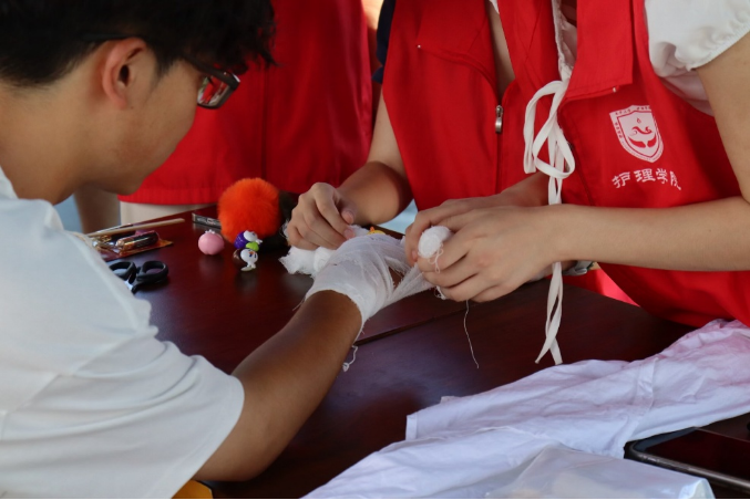 针对夏季景区高发的中暑、防晒伤、毒蛇蚊虫叮咬等安全隐患,团队成员精心设计趣味知识竞答,寓教于乐,将相关知识融入游戏,很受亲子游客的欢迎。包扎摊位上,护理学专业的同学耐心讲解包扎技巧,手指穿梭交替,尽显耐心与专业。防“三高”摊位前,排满了准备测血压的游客,通过解读血压计上的数值,结合防“三高”宣传手册,向游客们普及了“三高”与慢性病之间的关系和预防“三高”的相关措施。
