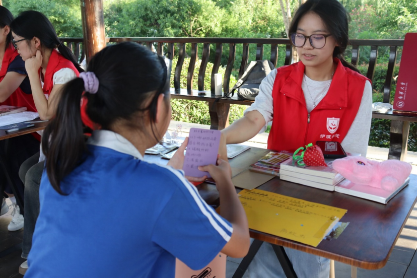 (图为“湘聚南华 兴梦实践团”志愿服务团队在东洲岛景区设摊摆点宣讲)