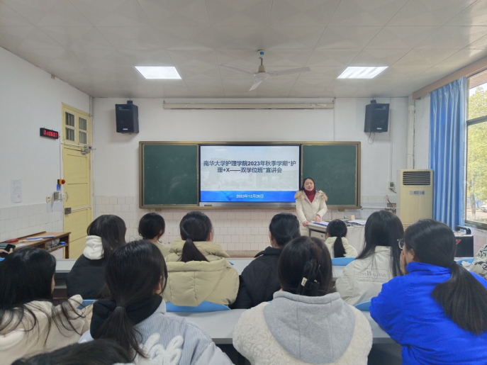 2023年12月26日,PA视讯,PA视讯2023年秋季学期“护理+X——双学位班”宣讲会在PA视讯学术报告厅举办,宣讲会由PA视讯副院长王蓉主讲,PA视讯23级学生代表参与答疑和交流。