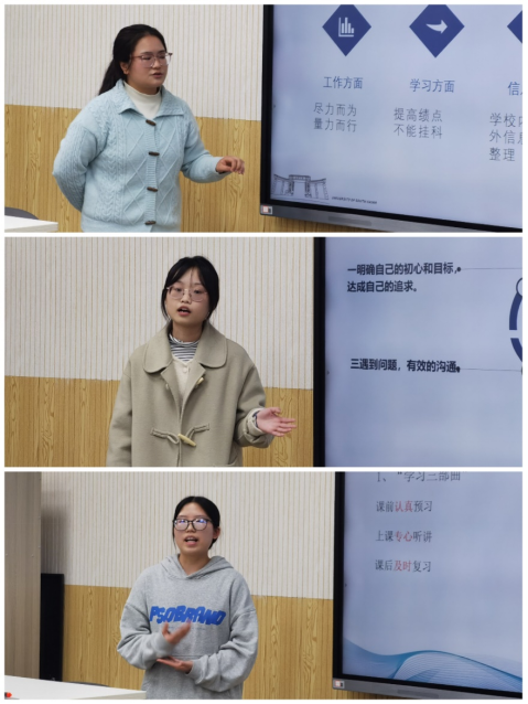 本次报告会邀请了曾荣获国家奖学金、国家励志奖学金、学校奖学金等荣誉的陈慧、魏晨、詹美晨3名同学进行分享,他们结合自身经历,分别从日常学习与工作的时间平衡、研究生推免等方面分享了自己的学习心得、成长经历和感悟建议。护理2001班陈慧首先分享了保研的前期准备、面试要求以及如何提前与导师联系等内容,鼓励学弟学妹们“即使天空有乌云,但乌云缝里的夕阳依然灿烂!”护理2005班魏晨则从校园生活、研究生支教团推免和实习三方面分享了自己的经历,提醒要学会查询资料,提前做好准备,养成主动学习的习惯。护理2102班詹美晨平铺直叙,讲述了护理学专业的学习方法和学生干部工作经验,学会做好学习和学生工作之间的平衡。