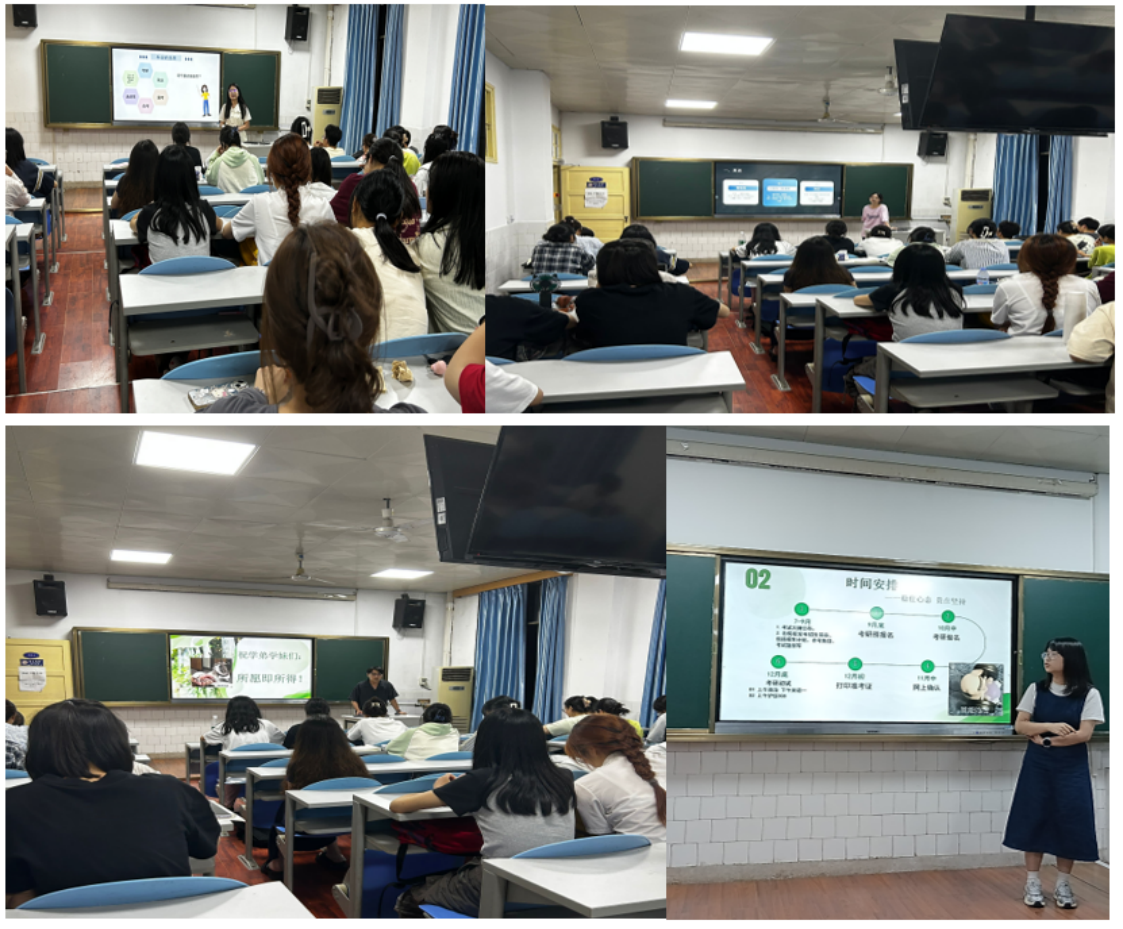 4名同学分别从院校和专业选择、备考时间规划、课程学习方法以及信息获取渠道、心态调整、调剂复试等方面进行了精彩的分享。他们均强调要提前做好各门课程的学习规划,多刷题、多复盘,以强大的内心迎接各种挑战,不畏艰辛,勇往直前。在互动答疑环节,同学们积极踊跃提问,对于如何平衡实习和考研复习,英语、政治与专业课如何科学学习,专业跨考有哪些顾虑等内容,杨艳萍等学长学姐们热情详细地进行了解答并鼓励同学们相信自己,“因为黎明前最黑暗,胜利前最绝望,成功前最渺茫。”
