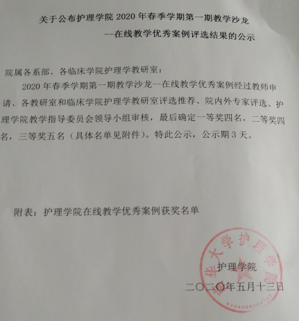 2020年5月13日下午,学院开展在线教学案例评选,经院内外专家评审,评选出一等奖四名,分别是PA视讯王蓉、伍春;第二临床学院刘桂芳团队;南华临床学院仇秋菊。二等奖四名,分别是PA视讯尹心红、赵玲;第一临床学院欧玉兰团队、第二临床学院谭玲玲团队。三等奖五名,分别是PA视讯胡红娟、吴飞;第二临床学院颜华艳团队;南华临床学院伍思娜。
