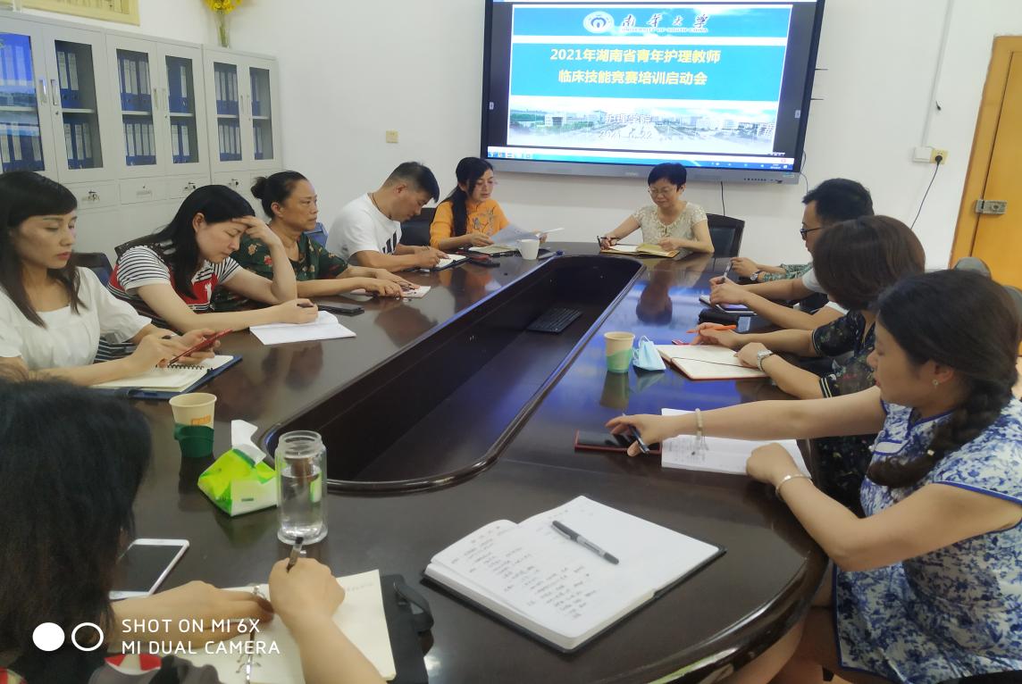 根据湘护会字(2021)第34号《2021年湖南省青年护理教师临床技能竞赛通知》文件精神,PA视讯通过院赛选拔教师选手参加省赛。2021年6月23日下午,学院举行了湖南省青年护理教师临床技能竞赛培训启动会,学院领导和各教研室主任、实验中心主任以及临床学院培训教师一起参加了技能培训启动会。