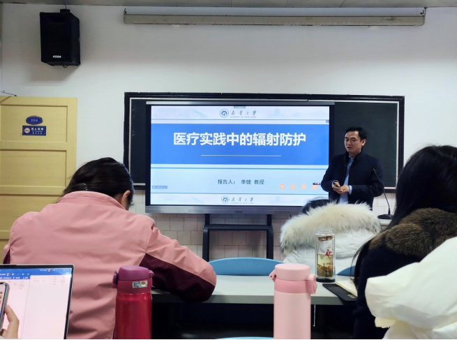 首先,单健教授从医学中辐射防护的发展历程出发围绕放射医学的诊疗过程展开本次专题讲座,结合医学特点,从辐射防护角度中的防护要求、原则及具体措施等内容进行研究经验的分享,还为大家详细讲解医护人员暴露在辐射环境中的预防注意事项。单教授的讲座内容专业应用性强、操作要求高,在放射生态效益的实践中具有很强的实用性和指导性。参会师生积极发言提问,均纷纷表示在此次讲座中受益匪浅,进一步增进了自身对辐射防护的了解。