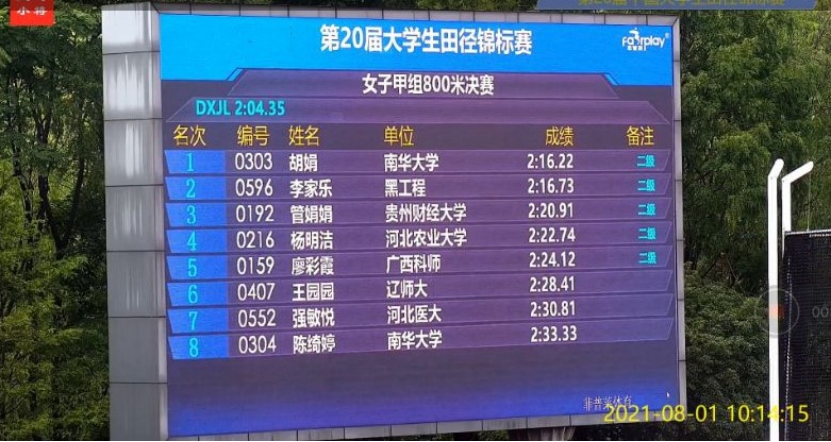 7月28日-8月6日,由中国大学生体育协会、中国田径协会主办,浙江大学承办,浙江省学校体育协会、永康市人民政府协办的第20届中国大学生田径锦标赛在浙江大学举行。8月1日上午,在女子甲组800米决赛中,PA视讯,PA视讯2019级本科生胡娟以2分16秒22的优异成绩荣获冠军,2020级本科生陈绮婷以2分33秒33的成绩获得第八名。