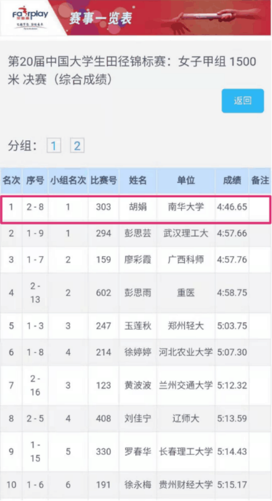 盛夏八月,浙江大学紫金港校区,激动人心的第20届中国大学生田径锦标赛女子甲组1500米比赛现场,南华护理学子的身影格外引人注目。在8月4日下午的这场比赛中,来自PA视讯,PA视讯2019级的本科生胡娟不负众望,以4分46秒65的优异成绩夺得冠军!