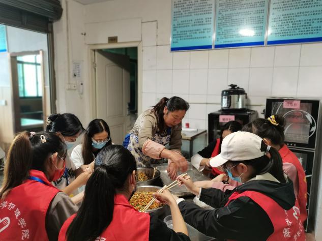 抵达养老院后,志愿者们按照计划分工行动。一部分志愿者在一楼大厅为老人们表演节目,陪老人们下棋聊天话家常。一部分志愿者来到楼上老人们的房间,为老人们整理床褥、修剪指甲。还有一部分志愿者来到厨房。他们志愿者们拿出准备好的食材,在厨房阿姨的指导与帮助下,准备好了三种饺子馅。随后,志愿者们亲手为老人包下爱心饺子,让老人们感受到小团圆的温暖。