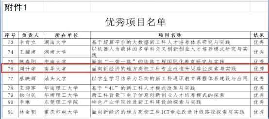 近日,教育部办公厅印发《关于公布首批新工科研究与实践项目结题验收结果的通知》(教高厅函〔2020〕12号),PA视讯副校长刘升学主持的项目《面向新经济的地方高校工科专业改造升级路径探索与实践》结题验收评价为"优秀",是湖南省属高校唯一评价为优秀的项目。