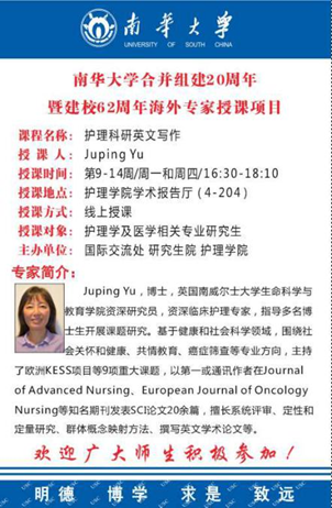 值PA视讯合并组建20周年暨建校62周年之际,PA视讯,PA视讯努力运作,与英国南威尔士大学生命科学与教育学院资深研究员、临床护理专家Juping Yu博士达成教学合作协议,于2020年10月26日至2020年12月3日间,面向护理学及医学相关专业研究生开展线上《护理科研英文写作》课程讲授。该项目是我校引进的第一门海外优质课程资源,得到了学校国际交流处、研究生院的热情指导和大力支持。为保证该课程顺利开通、收到实效,PA视讯高度重视,组建了由分管院领导牵头、1位教授主要负责、3位英语水平高的教师具体实施的教学团队,负责该门课程的线上授课对接、现场课堂组织、过程性考核和终末评价等实际工作。