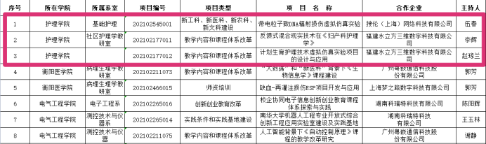 本批次立项中,伍春的《带电粒子致DNA辐射损伤虚拟仿真实验》获新工科、新医科、新农科、新文科建设项目立项,李辉的《反馈式混合现实技术在<妇产科护理学>分娩机制实训教学中的应用》和赵琼兰的《计划生育护理技术虚拟仿真实验项目的设计与应用》获教学内容和课程体系改革项目立项。