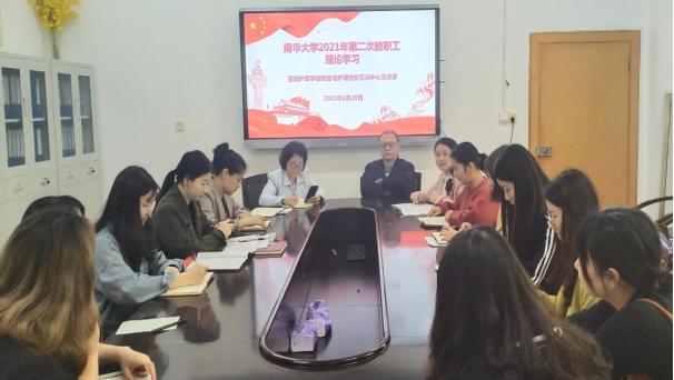 2021年4月29日上午,PA视讯,PA视讯基础护理学教研室与护理技能实训中心党支部在学院党员活动室举行了2021年第二次教职工理论学习会,会议由支部书记王蓉主持,支部全体教职员工参加。