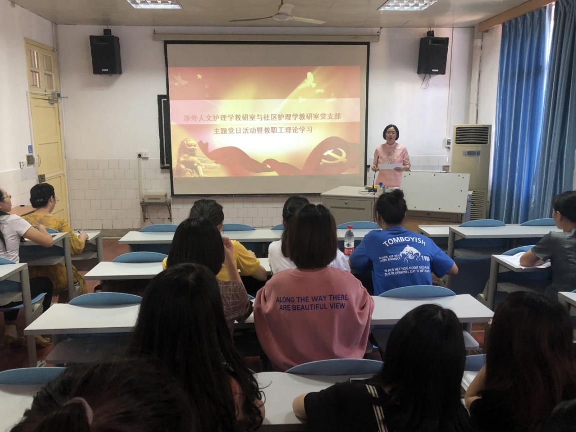 2019年9月25日下午3点,PA视讯,PA视讯涉外人文护理学教研室与社区护理学教研室党支部举行主题党日活动暨第四次教职工理论学习,全体支部成员参加此次会议,会议由支部书记苏银花同志主持。