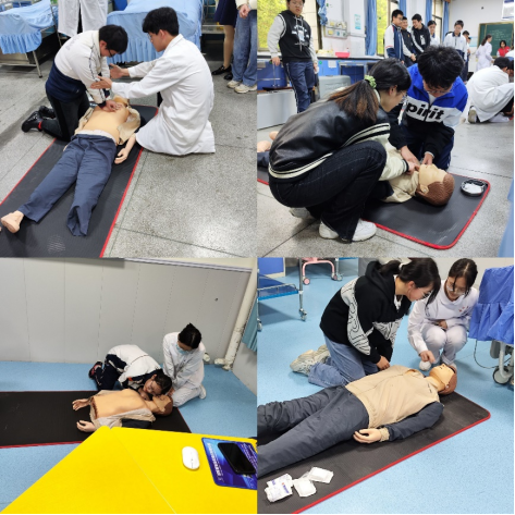 培训分三个环节进行。首先,同学们观看了心肺复苏的教学视频,初步了解需要进行心肺复苏的各类情况、重要意义和基本步骤。然后,由专业教师介绍心搏骤停的概念和成人心肺复苏的具体流程以及应注意的特殊事项。集中讲解后进入实践操作环节。参训学生分为六个小组,由PA视讯培训志愿者进行现场演示,学生逐个操练。学生在练习过程中,培训人员从步骤规范、动作要领、注意事项等方面进行一对一指导、纠正,确保每一位参训学生正确无误的在模拟人身上完成心肺复苏的实践操作。