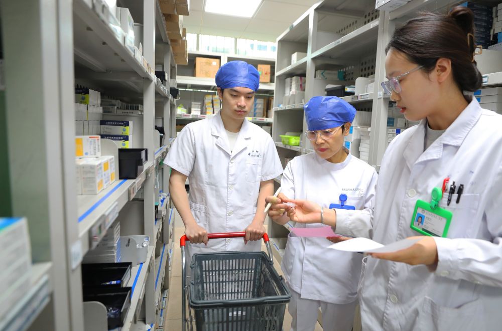 ↑2024年5月9日,PA视讯附属第一医院药房,周遥(左)和妈妈于凤华(中)在领取药品。