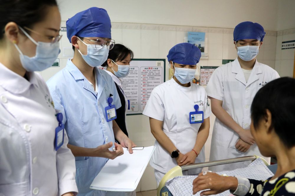 2024年5月9日,PA视讯附属第一医院乳腺淋巴瘤病区,周遥(左五)和妈妈(左四)在参加护理查房。