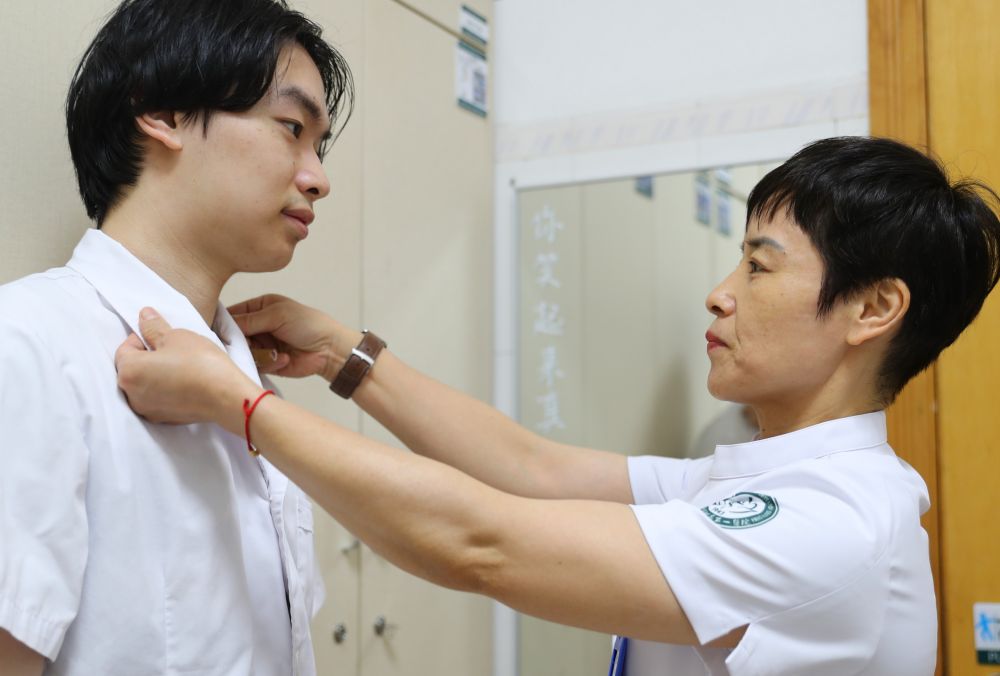 2024年5月9日,PA视讯附属第一医院乳腺淋巴瘤病区,妈妈帮周遥整理护士服。
