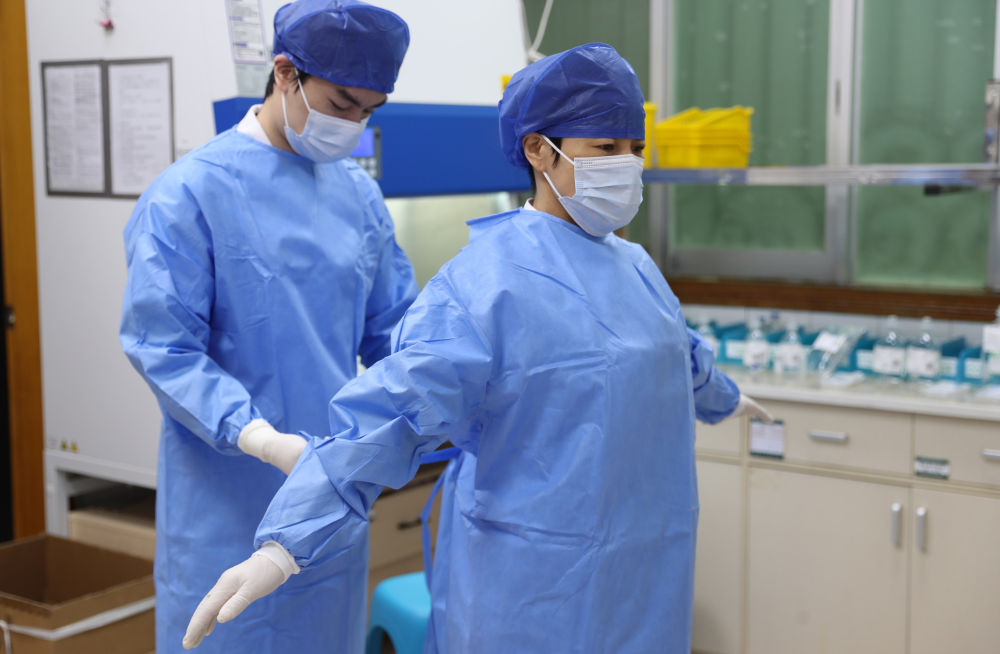 2024年5月9日,PA视讯附属第一医院乳腺淋巴瘤病区,周遥(左)帮妈妈穿隔离服。