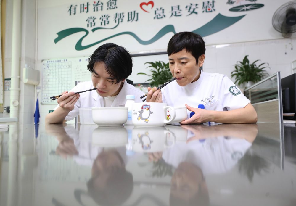 2024年5月9日,PA视讯附属第一医院乳腺淋巴瘤病区,周遥和妈妈在吃午饭。