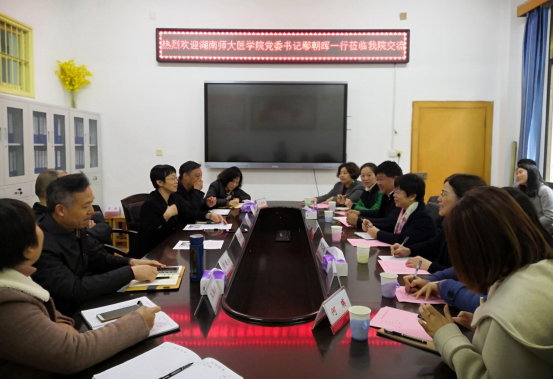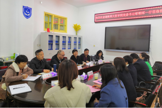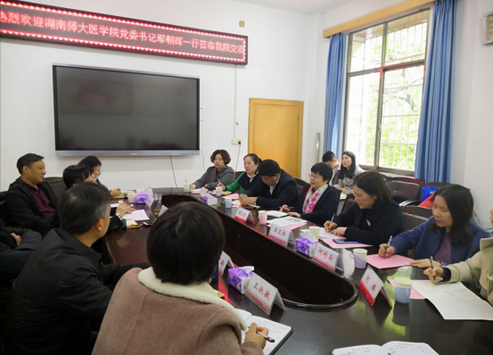 2021年4月6日上午,湖南师范大学医学院党委书记鄢朝晖、党委副书记陈松带领党委办、学工办、团委一行9人到我院考察调研。PA视讯党委书记陈晓坚,院长廖力,党委副书记彭建南,组织员刘和福,院办主任王晓兰,教务办主任王淑敏出席座谈交流会。此次交流会在PA视讯二楼会议室举行。