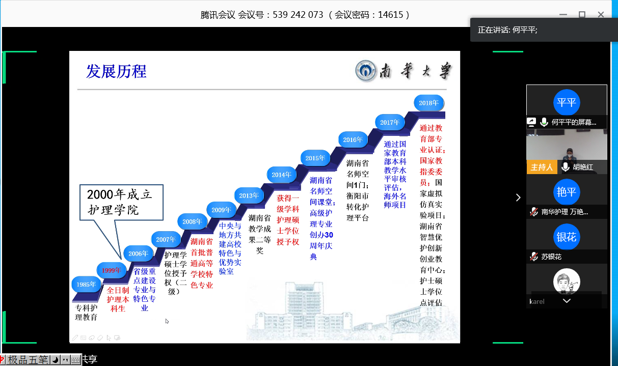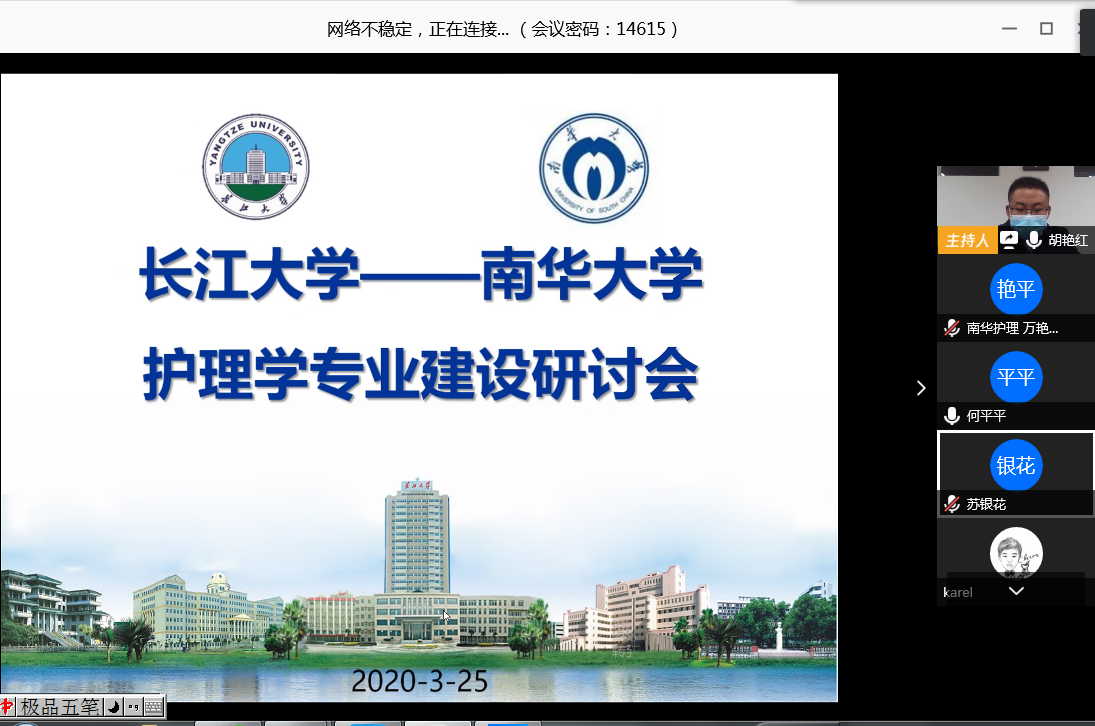 疫情时期,地处湖北省荆州市的长江大学悉知我院护理学专业成功获批国家级一流本科专业建设点,并以优秀成绩通过了教育部护理学专业认证,希望学习我校经验,因疫情不能实地考察,故于2020年3月25日上午9点召开护理学专业建设视频研讨会,两校就护理学专业国家级一流本科专业建设点申报与建设、本科专业认证评估等方面进行深度交流。长江大学医学部常务副部长龚权、副部长黄江荣、健康医学院副院长陈晓光、护理系主任周红、护理系副主任龚爱萍、胡艳红,PA视讯,PA视讯院长廖力、副院长何平平、曾谷清、党委副书记彭建南,以及两校各教研室主任和全体教师参与了此次视频研讨会。会议由长江大学陈晓光副院长与PA视讯,PA视讯何平平副院长共同主持。