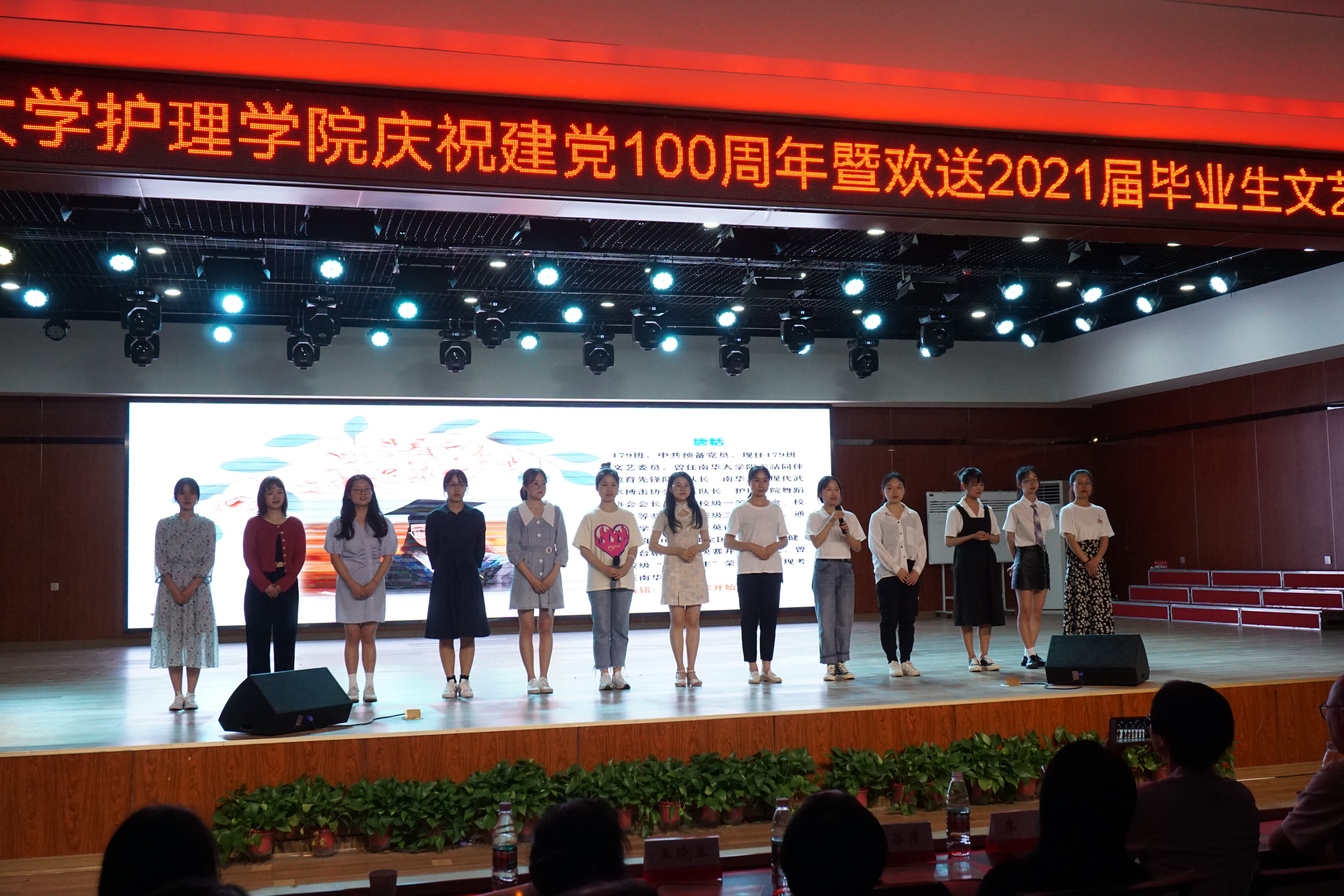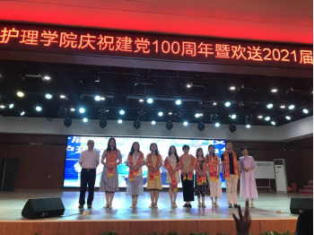 在节目中场环节,由李翼老师带领学院2021年新发展党员进行入党宣誓;院领导分别为“颂歌献给党”主题征文比赛、第十届中国大学生医学技术技能大赛护理学专业赛道全国总决赛获奖师生颁奖、绶带;2017级考研学子代表上台告白,现场温馨感人。